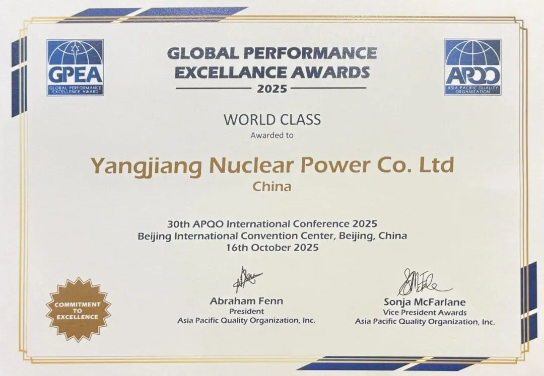 从质量文化培育、战略目标落地,到顾客需求响应、核心过程优化,一系列管理改进让企业运营成熟度持续提升:安质环绩效长期保持行业高端稳定,机组能力因子、WANO(世界核电运营者协会)指标等核心业绩均达到国际标杆水平,构建核电厂群堆管理模式的典型经验还获得亚太质量组织国际最佳实践。